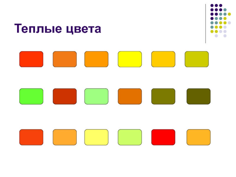 Одна группа цветов в цветовом круге ассоциируется с солнцем, теплом и огнем. Эти цвета называются теплыми, так как вызывают у людей теплые чувства. Желтый, красный, оранжевый и разные оттенки этих цветов — теплые цвета.