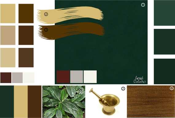 Темно-зеленый с коричневым сочетаются образуя одну из самых распространенных комбинаций. Спокойная, стабильная, уверенная пара – это отражение природного равновесия, где коричневый выступает в роли земли, коры, животных, а зеленый – растительность. Сочетание основано на цвете дуба, желто-коричневом, золотисто-каштановом, махагоне, кофейном.