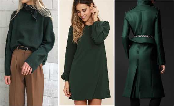 Чаще всего темно-зеленый можно увидеть в осенне-зимних коллекциях. Он хорош для повседневной носки, для деловых встреч, прекрасен в вечернем гардеробе, но слишком чопорный для отдыха, за исключением туристического.
