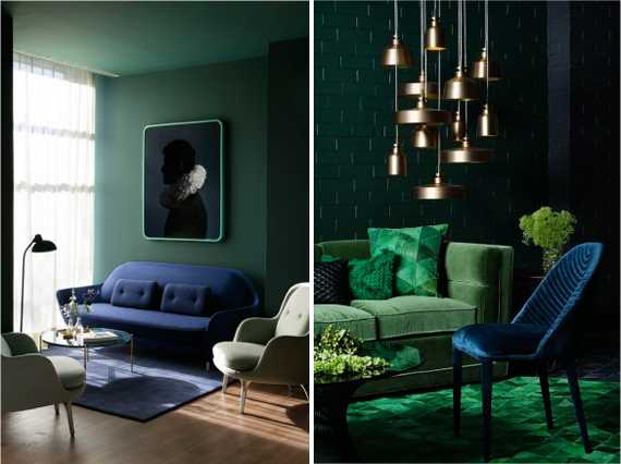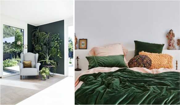 Темно-зеленый цвет добавляет веса в интерьерный дизайн. Это шик и устойчивость традиций, накопленного богатства, спокойствия и уверенности в завтрашнем дне. Поэтому частый спутник темного зеленого – золото, золотисто бежевый, коричневый, темно-синий. Акцентами служат красные, желтые, персиковые тона.