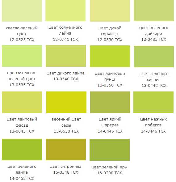 Желто-зелеными обычно называют оттенки светлые или средние. Это чистые, мягкие или звонкие краски с преобладанием желтого тона в составе. К более приглушенным тонам примешивается серый или красный, делая цвет бледнее или уводя его в оливковый. Вот так можно представить данный тон в системе красок Pantone для текстиля.