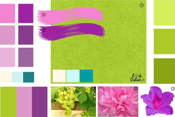 Сочетание зелено-желтого с розовым – возрождение, вдохновение. Это сочетание навеяно весенним цветением. В нем будут хороши оттенки розового, как нежные, так и насыщенные. В таблице участвуют светло-розовый, перламутровый, лососевый, фуксия, малиновый.