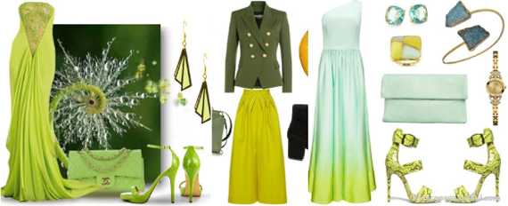 Лучше всего сочетаются с зелено-желтым в одежде коричневые, розовые и синие тона. Нельзя забывать о привлекательности композиций, составленных из разных оттенков зелени.