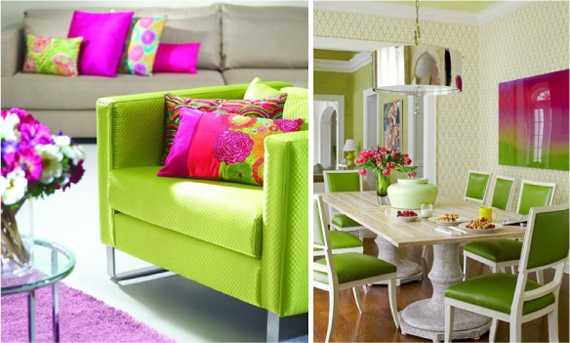 Так сочетание зелено-желтого и розового будет хорошо смотреться в спальне, женском клубе или бутике с женской одеждой. Чередуйте фактурные поверхности с гладкими.