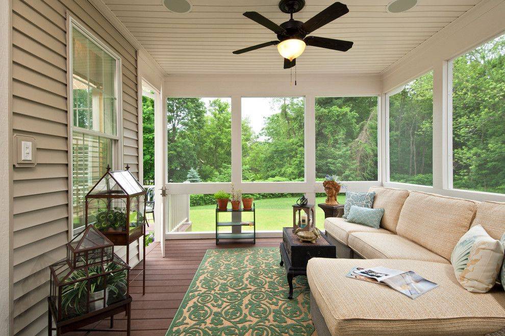 - Веранда – застекленное сооружение, в котором при необходимости можно провести отопление, теплый пол, канализацию. Можно полностью обустроить ее как жилую комнату, поставить диван, завести небольшую оранжерею, ухаживать за цветами.