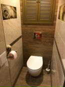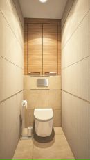 - унитаз полностью окружён шкафчиками разной ширины и размера, он стоит в нише и это выглядит некрасиво