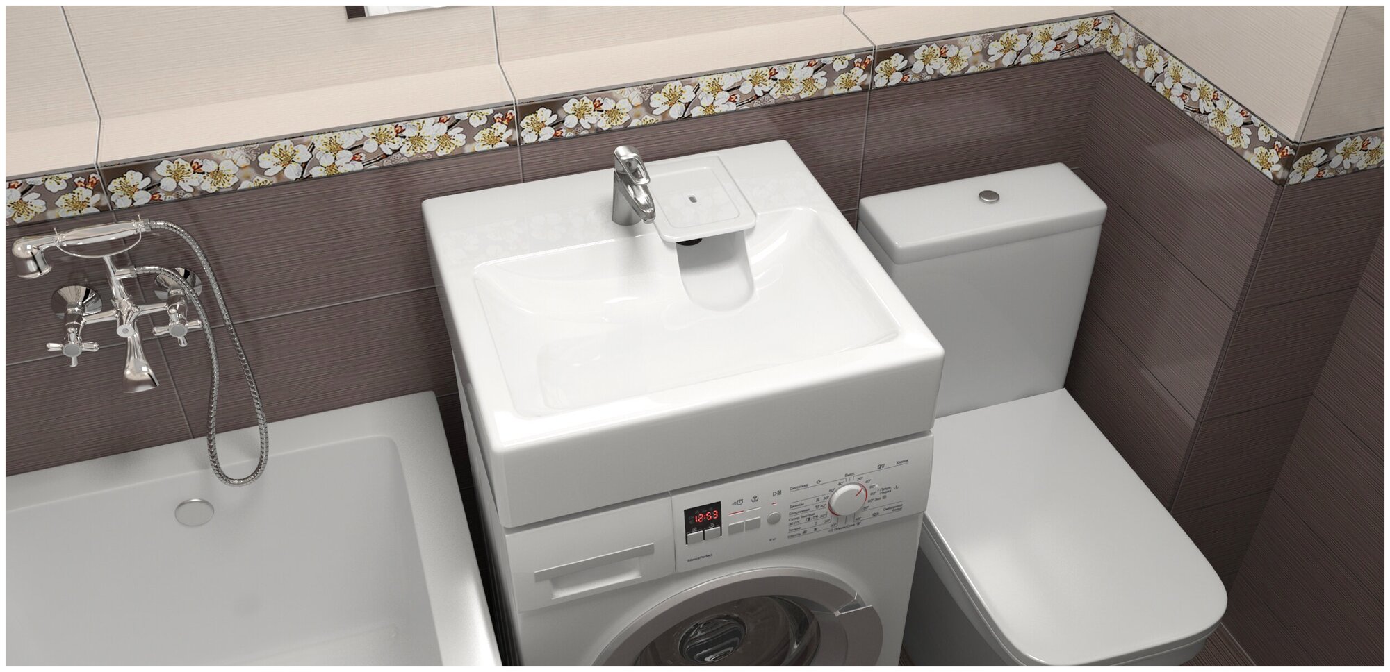А также существует вариант, при котором возможно установить стиральную машину вместо раковины, а умываться с помощью крана в ванной. Для этого потребуется приобрести и установить смеситель с длинным поворотным гусаком для удобства его эксплуатации.