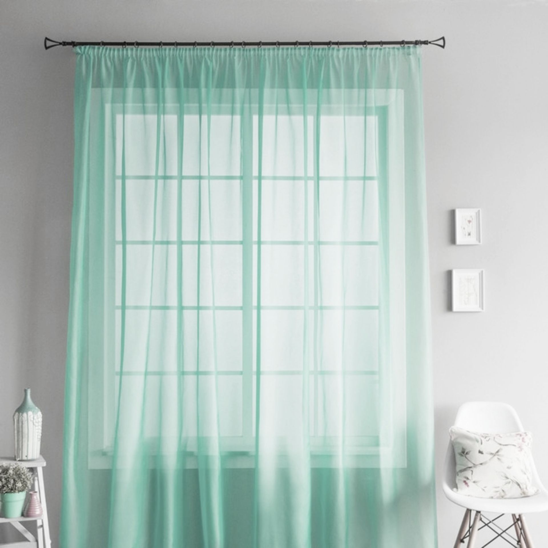 На фото интерьер, где полупрозрачная бирюзовая органза сочетается с серыми портьерами и выступает ярким акцентом.