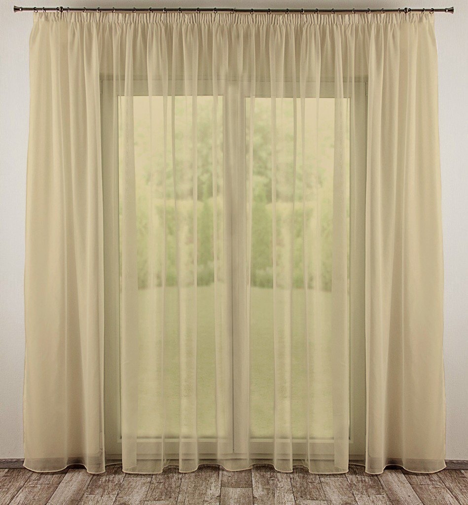 На фото бежевый однотонный тюль, который в светлом оттенке подходит под интерьер без ярко выраженного акцента на конкретном цвете.