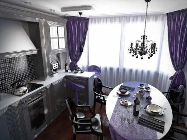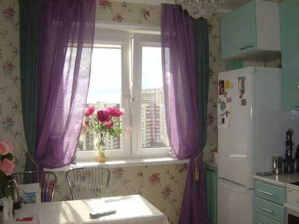 Ярко-сиреневая кисея в пол хорошо будет сочетаться с белым кухонным гарнитуром.