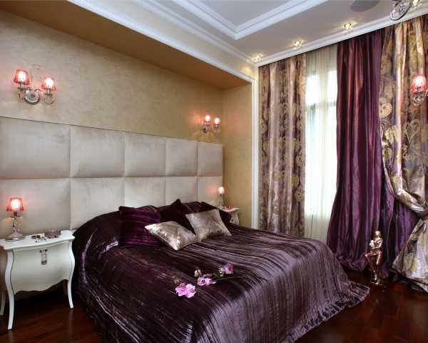 Уместны для классической спальни крупные цветастые и растительные узоры, драпированные портьеры на подхватах.