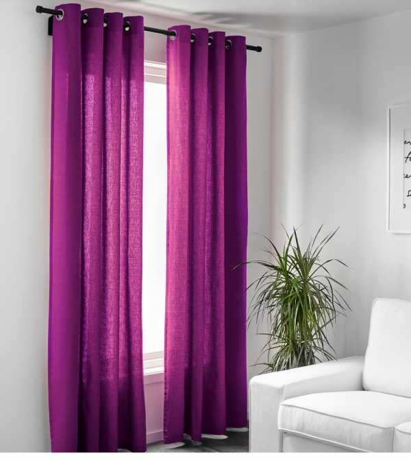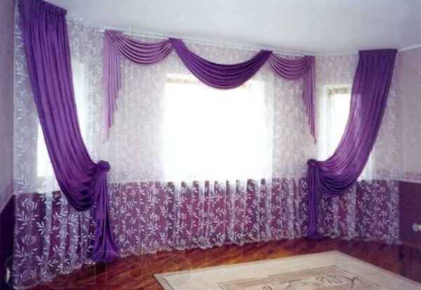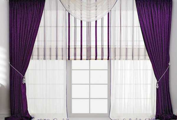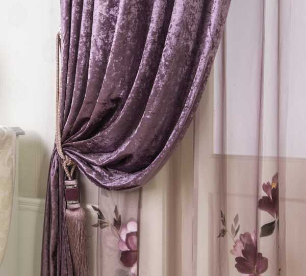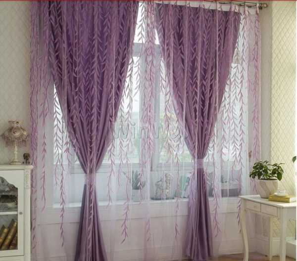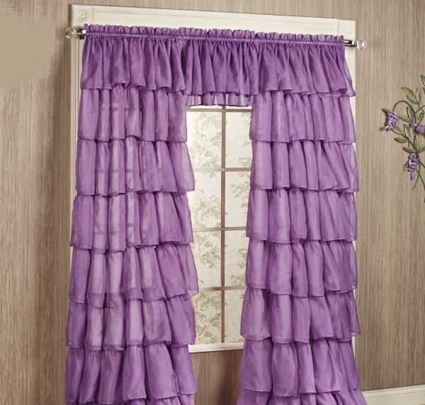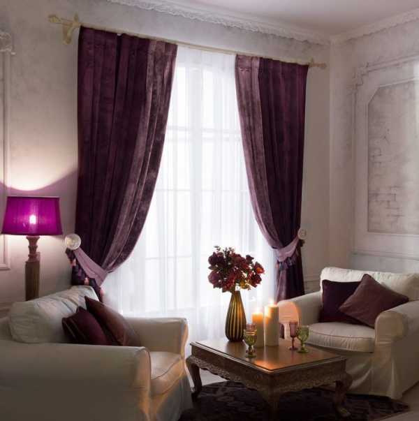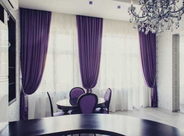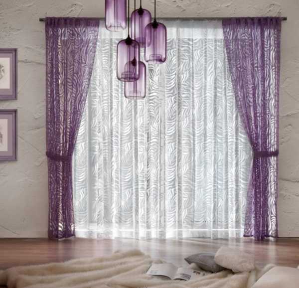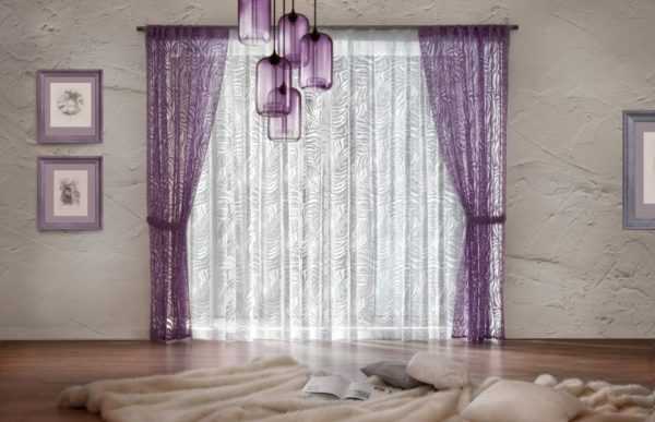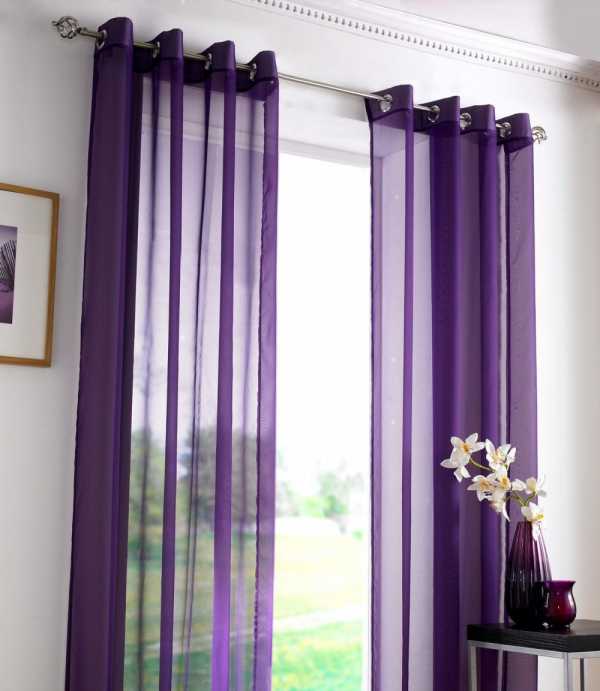 Разнообразие тканей и цветовых оттенков позволяет использовать фиалковый тюль в разных стилях — от незатейливого минимализма до помпезного барокко.