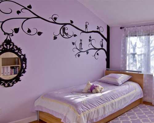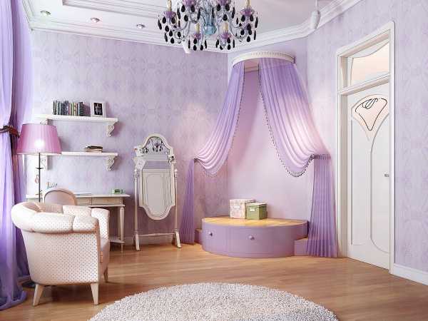 Сочетание фиолетового и пастельных цветов формирует уютную, легкую и комфортную обстановку, уместную в интерьере детской комнаты. Благодаря сиреневому цвету у ребенка формируется ощущение безопасности, спокойствия и постоянства. Воздушная атмосфера создается при помощи выкрашенных в светлые тона стен, белоснежной мебели и тончайшего, невесомого сиреневого тюля.