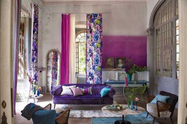 Фиолетовые тона и их оттенки создают выгодную композицию, при оформлении в едином стиле. Дизайнеры сочетают фиолетовые краски с фуксией, лазурью, нежными розовыми нюансами и синими акцентами.