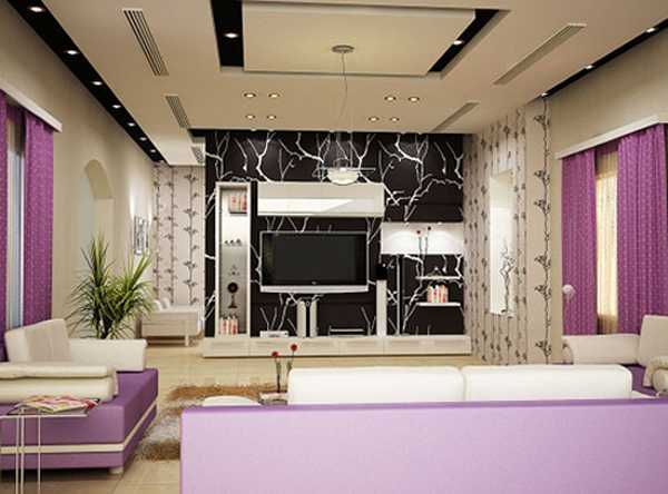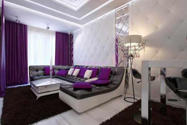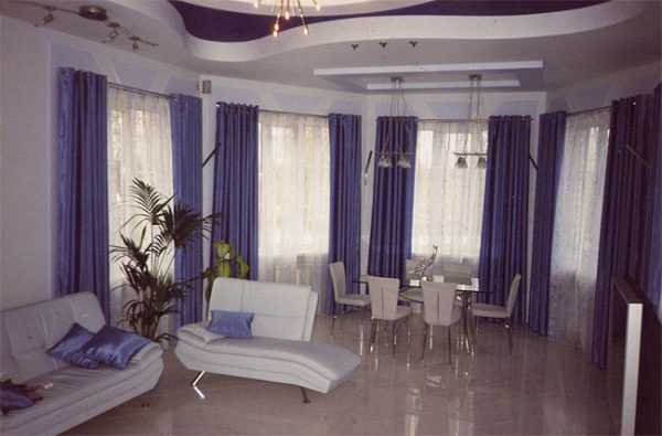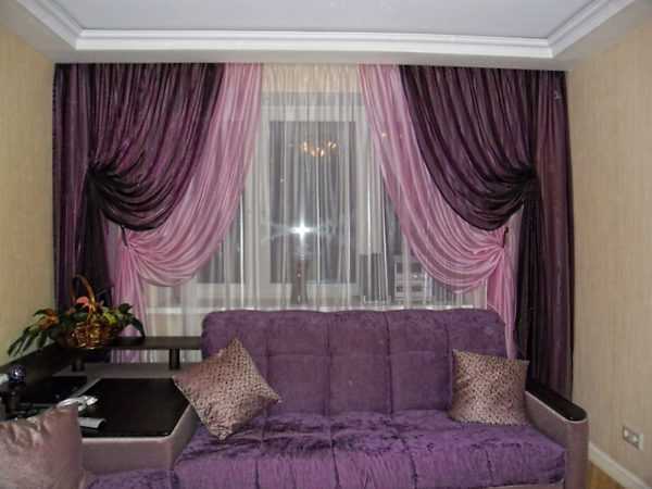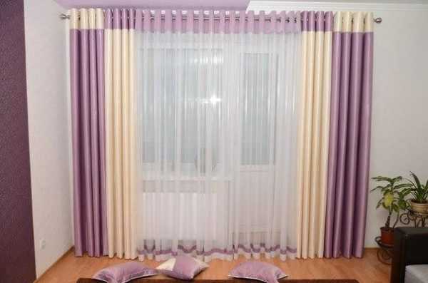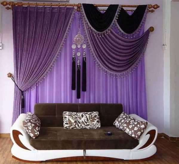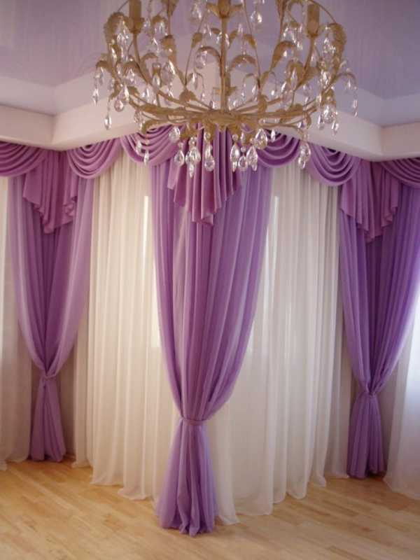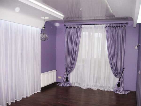 В зале стараются вешать портьеры из дорогой ткани. Сиреневые шторы будут совмещаться с белыми и создавать женственную атмосферу.