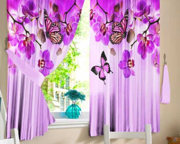 Умеренно яркие мотивы орхидеи – самое распространенное текстильное решение. Такой дизайн фиолетовых штор легко комбинировать с другими красками, но фон нужно подобрать грамотно.