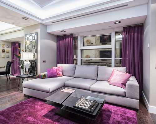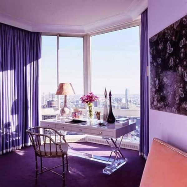 Если включение насыщенных стен в интерьер может вызвать у вас сомнения, то фиолетовые шторы или занавески, которые можно с легкостью заменить, — лучший вариант преобразить помещение. Их можно подобрать к обоям и рисунку на мебели или к другим деталям интерьера.