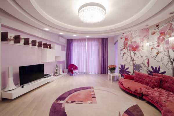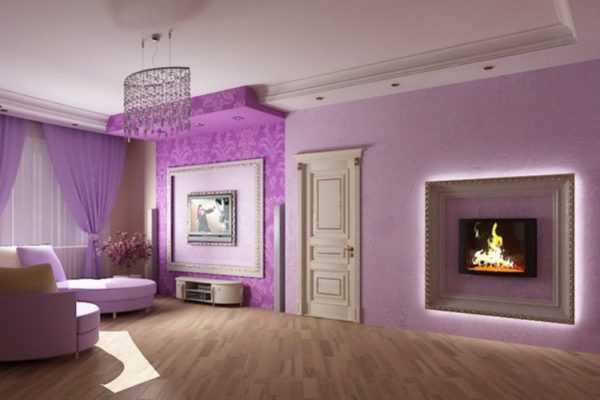 Сиреневый фон смотрится по-разному, в зависимости от освещения, цвета напольного покрытия, цвета мебели. В нем очень важно грамотное освещение. Тут не должно быть темных углов и плохо освещенных участков: