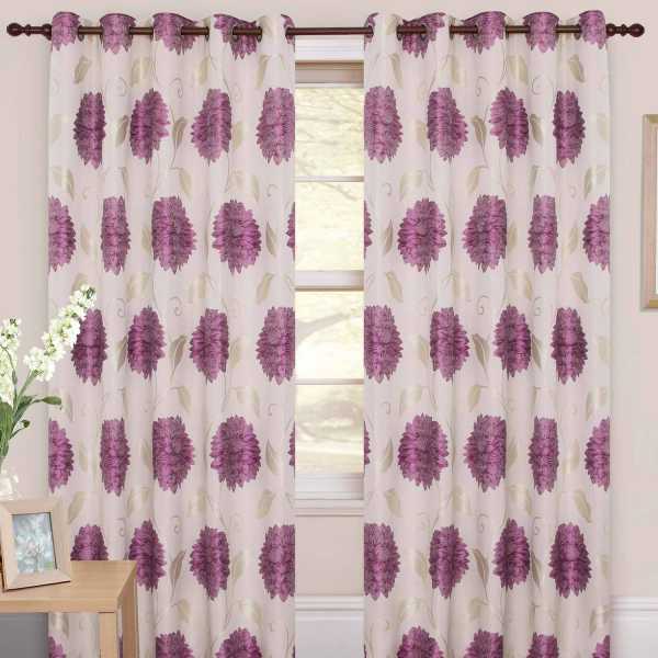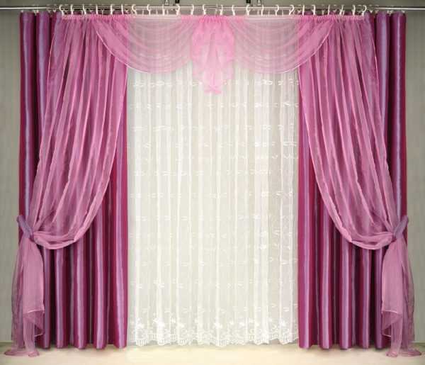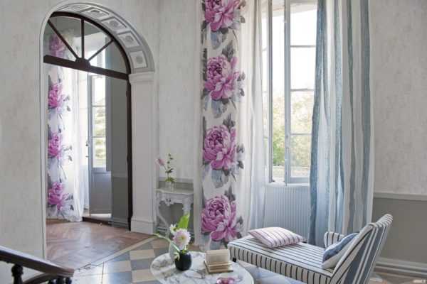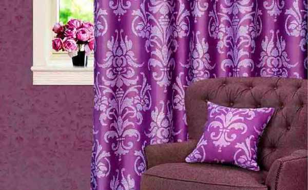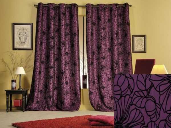Яркие лиловые мотивы, где преобладают розовые акценты, считаются кукольной краской. Такие шторы очень смелое решение. К ним сложно подобрать сопутствующий текстиль.
