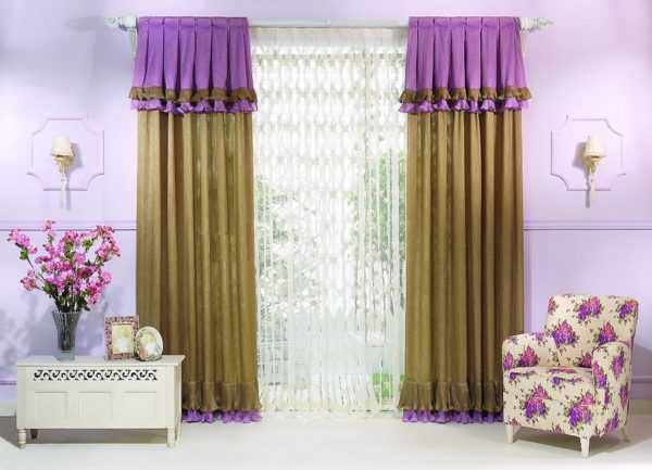 Хорошо смотрятся сиреневые ламбрекены с золотыми портьерами.