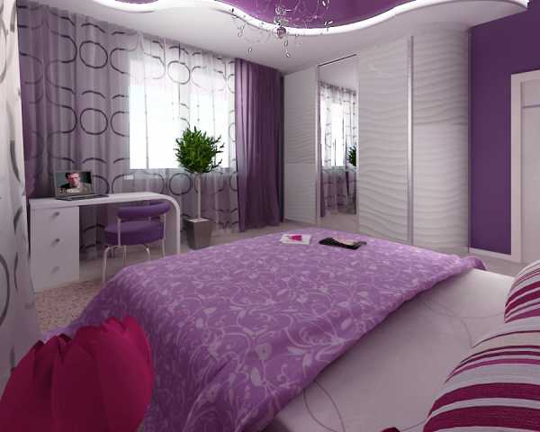 Если мебель этой комнаты белая, то сиреневые шторы будут создавать романтичную атмосферу. Можно повесить две раздвижные портьеры из оттенков одного и того же цвета. Для спальни подойдёт также бархатная штора лилового тона.