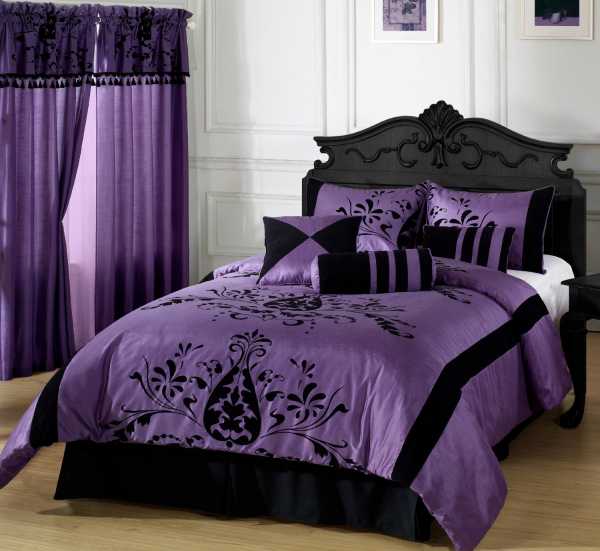 - Для семейной пары подойдут сиреневые шторы в сочетании с синими, коричневыми и чёрными тонами.