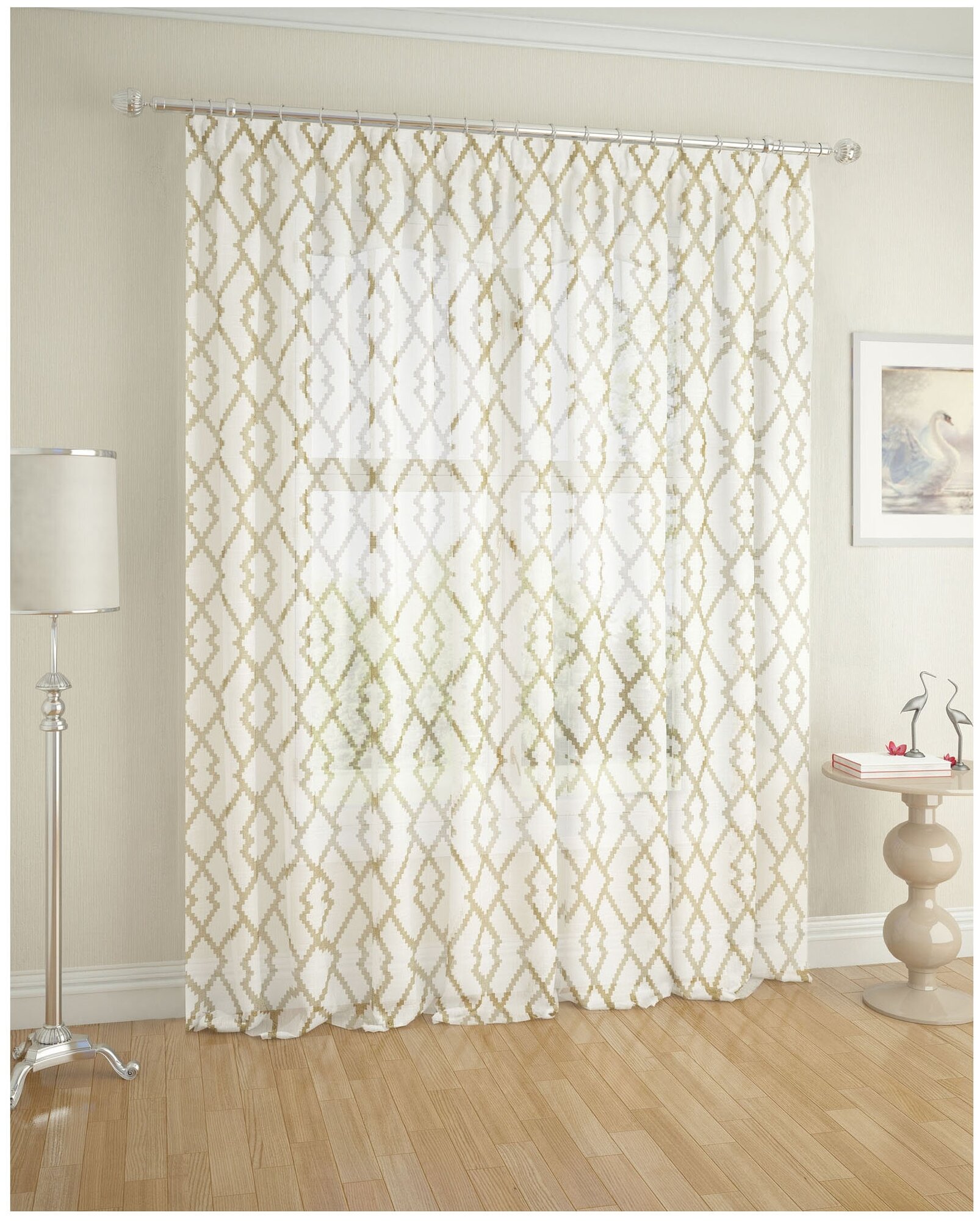 Для большой комнаты уместны гардины с крупным рисунком, геометрическим или растительным орнаментом.