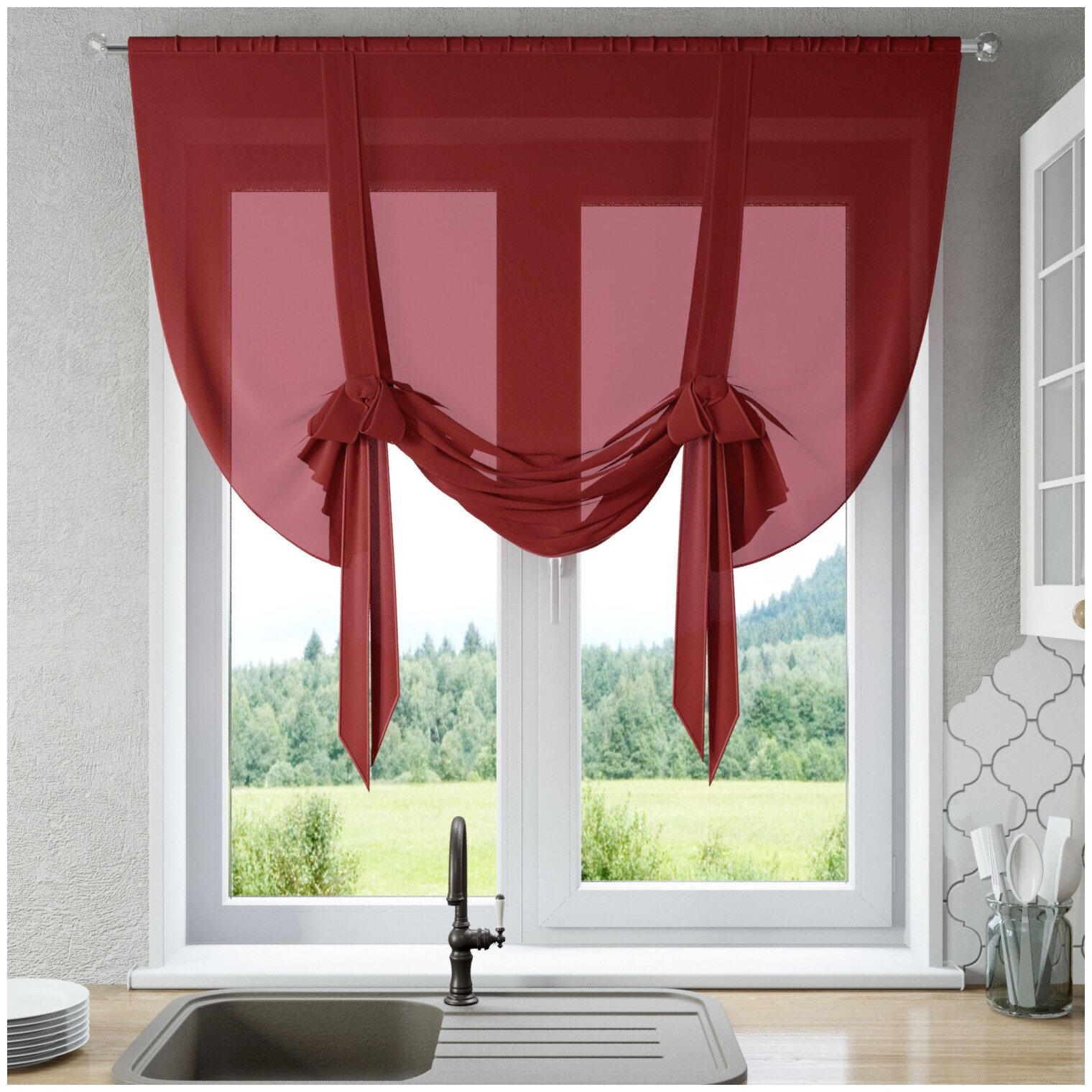 Кисею обычно используют в качестве декора: поверх белого прозрачного тюля навешивают цветную кисею. Есть множество различных идей, как использовать второй слой: можно по-разному эти нити завязывать, эффектно их переплетать, менять, формировать узлы, применять подхваты и магниты.