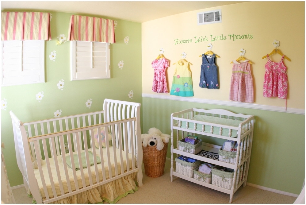 Стены вокруг детской кроватки младенца лучше как-то декорировать, но так как это комната совмещенная, следует использовать украшения, которые можно легко снять и заменить. Картинки в рамках, легкие небольшие полки для мелких игрушек, наклейки-липучки, поделки-оригами и гирлянды будут особенно хороши. К тому же, нельзя забывать о дополнительном освещении детской зоны: настольная лампа на комоде, бра на стене возле кроватки или устойчивый торшер создадут уютную атмосферу и обеспечат хороший свет.