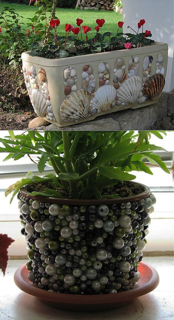 Оформить цветочный горшок можно и морскими камешками, стеклышками, пуговицами и мелкими монетами. Благодаря комбинированию материалов, автор расширяет поле для применения своей фантазии. При декорировании горшков с помощью ракушек или других мелких предметов, используется техника, аналогичная техники украшения изделия с помощью яичной скорлупы.