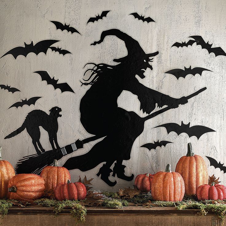 Из черного картона вырежьте по шаблону множество фигурок летучих мышей, желательно разного размера. При помощи двустороннего скотча закрепите мышек на свободном участке стены, располагая их в полете произвольно. Чтобы декор смотрелся объемнее, согните фигурки пополам.