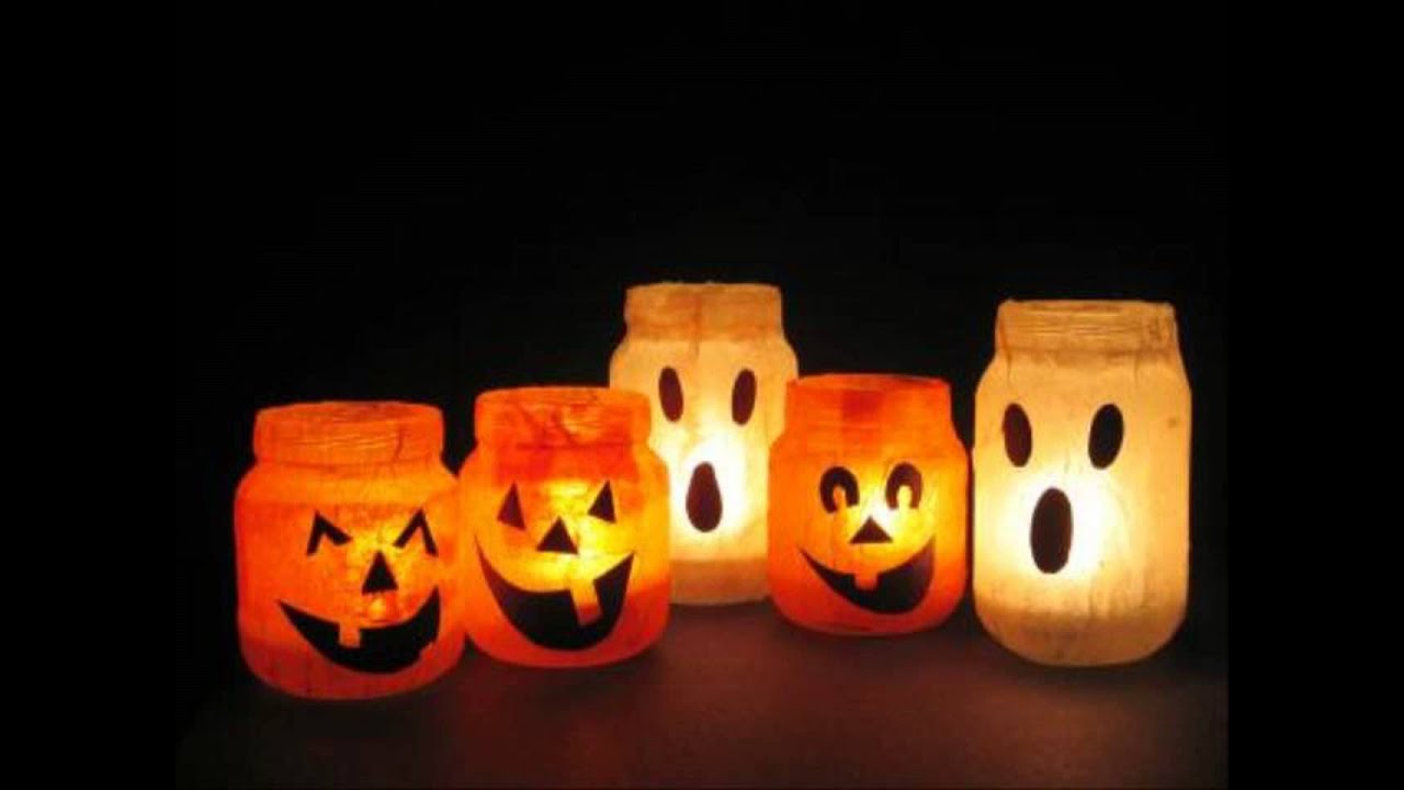 Вообще пользоваться в школьном классе свечами вряд ли разрешит учитель или администрация, но в подсвечники вы всегда можете поместить не настоящие свечи, а электронные, которые работают на батарейках и только имитируют настоящий огонь. Для подсвечников вам пригодятся любые стеклянные банки, которые сможете найти: покрасьте их оранжевой акриловой краской, а сверху нанесите узоры или рисунки черной краской.