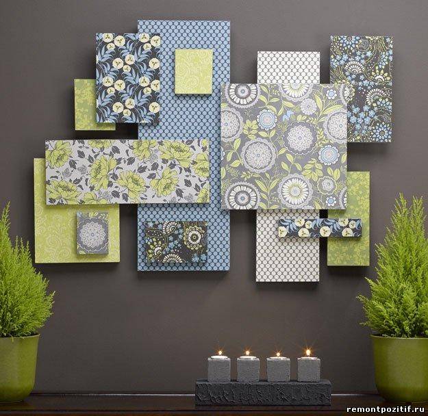 Композиции могут создаваться из различного текстиля, схожего по цветовой окраске или, наоборот, из одинаковой ткани с ярким рисунком. Лучше всего, если тканевые панно будут одного размера, однако размещаться они могут совершенно хаотично. Отличный метод, как украсить стену своими руками без дополнительных затрат на материалы.