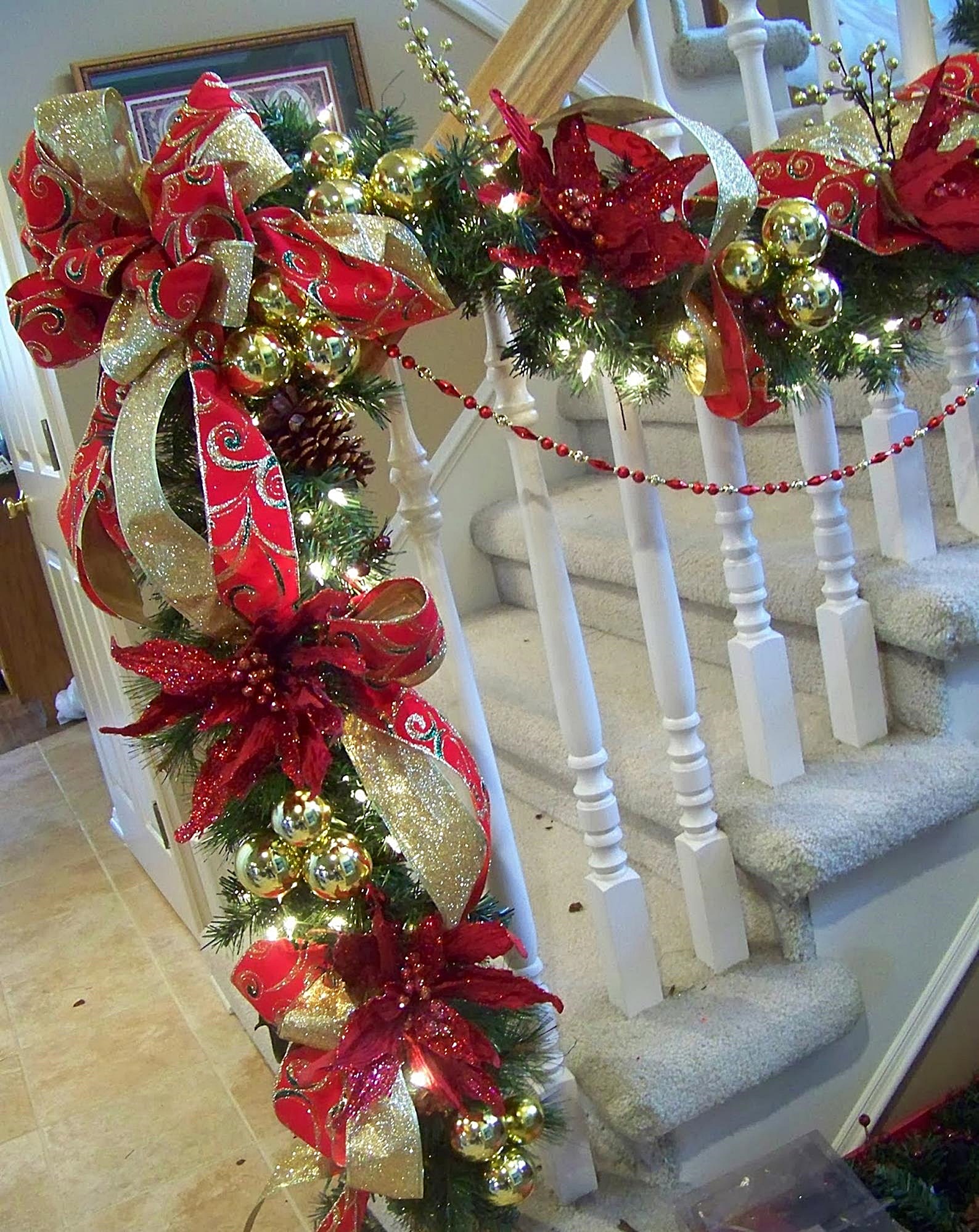 Новогоднее украшение лестницы в загородном доме