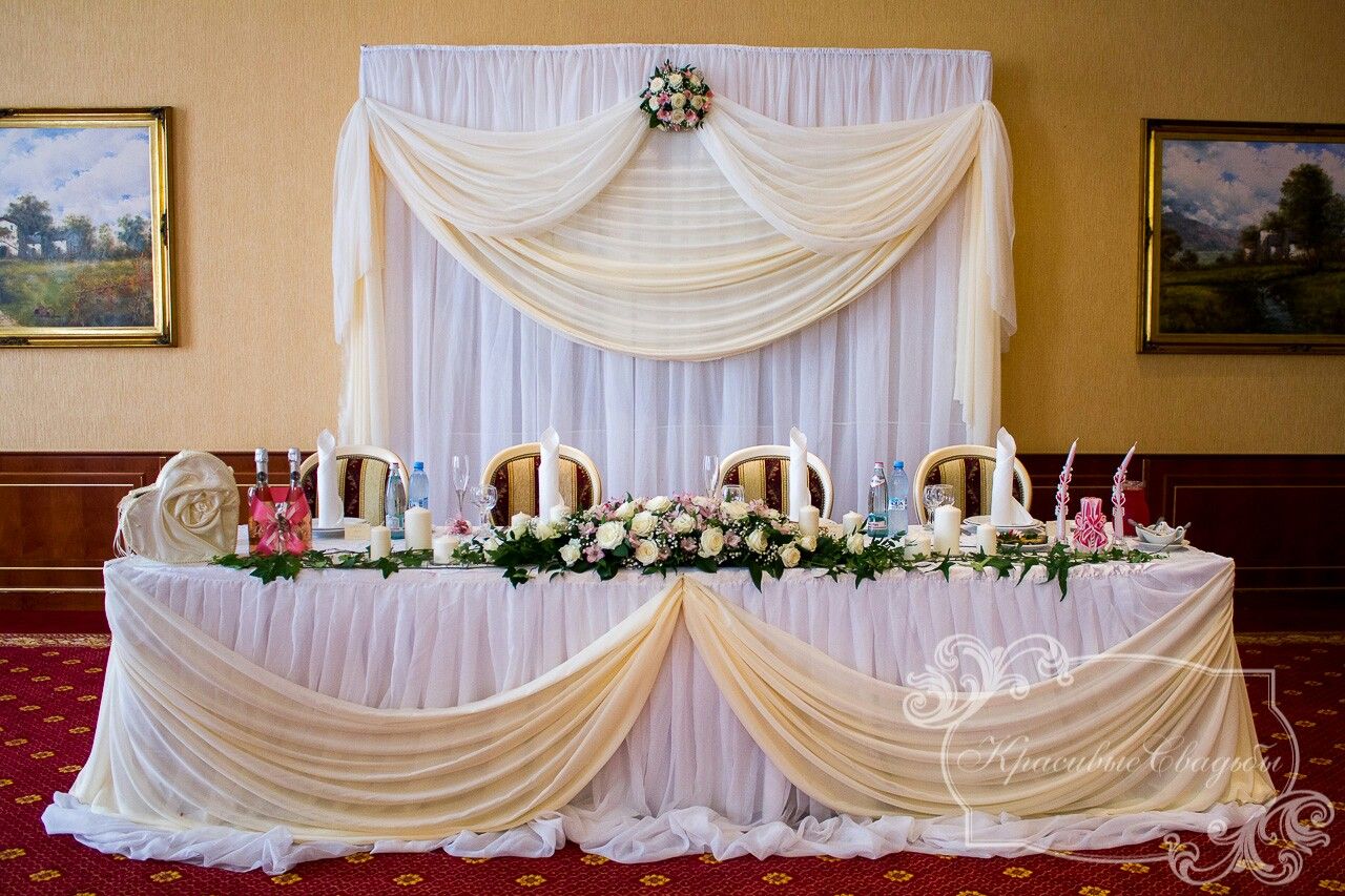 Стол молодых занимает центральное место на свадьбе. Не всегда для придания торжественности празднику требуется полное преображение зоны молодых (фон), в красивом интерьере или небольшом зале достаточно только оформления президиума.
