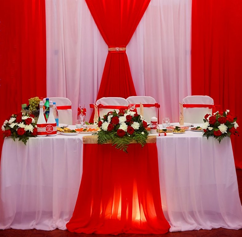 - Обязательное присутствие задника – пространства за молодоженами. Оригинальное оформление должно привлечь внимание всех гостей. Для работы используются идентичные материалы, применимые для свадебного стола молодоженов и зала.