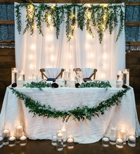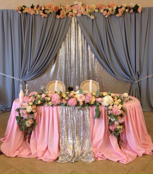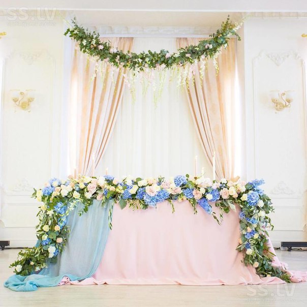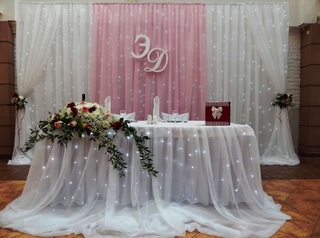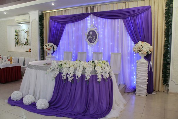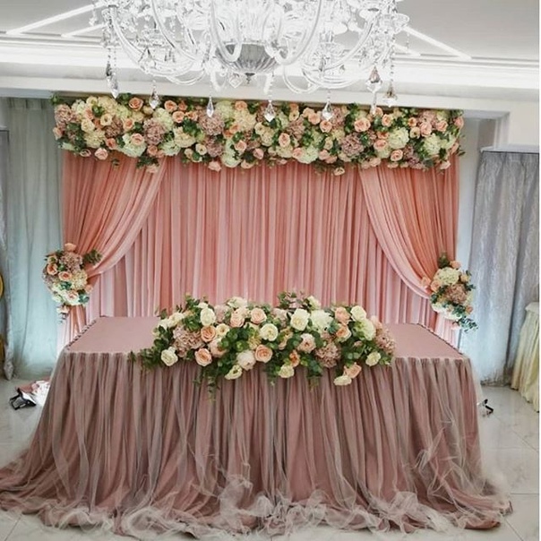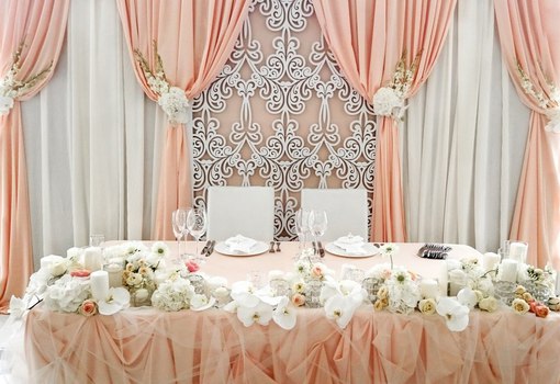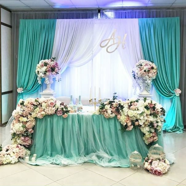 Интересно оформить стол жениха и невесты невозможно, если не организовать пространство за ним. Задник может быть оформлен живыми или искусственными цветами, воздушными шарами, лепестками, гирляндами, занавесом из лент, аркой, подвешенными к потолку цветочными розетками и так далее — вариантов много. Цвета и детали задника должны повторятся или обыгрываться в украшении стола молодых и столов гостей.