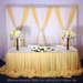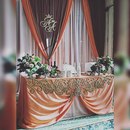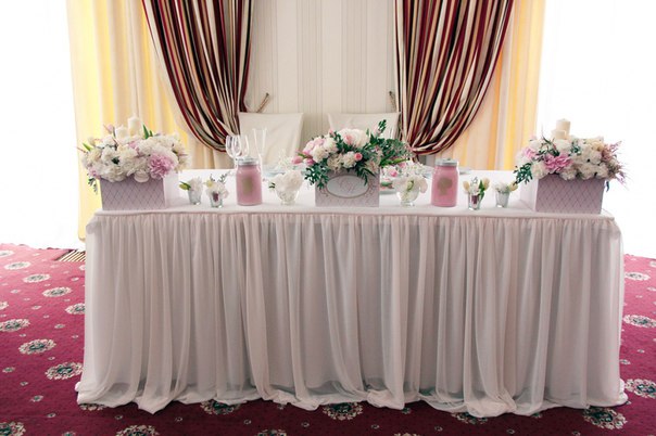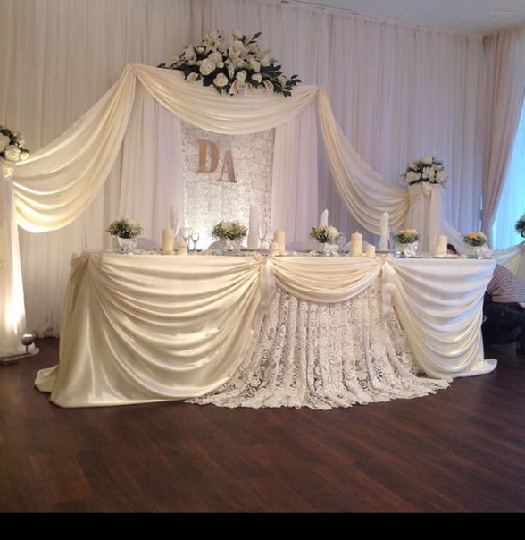 Акцент в оформлении стола жениха и невесты на фото ниже сделан на тканевый декор. Получилась воздушная и торжественная композиция.