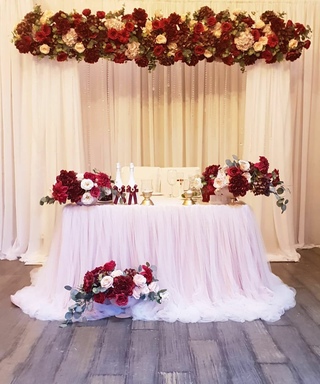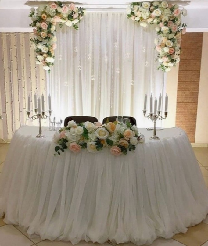 - Украшение свадебного стола жениха и невесты предполагает оформление не только поверхности стола, но и зоны перед ним и стены, находящейся за их посадочными местами.
