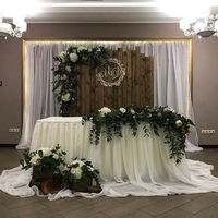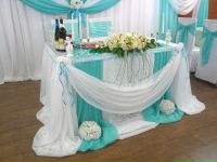 Другая тенденция тяготеет к пышной классике: складки и фалды на юбочке стола, объемные банты, вытянутые, роскошные цветочные композиции в центре и по бокам стола президиума, тканевое оформление задника, превращающее пространство возле стола жениха и невесты в альков.