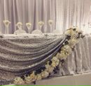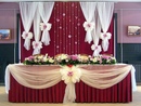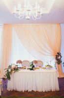 Часто к помощи текстиля прибегают для декорирования зоны за столом молодоженов – это различные занавески или просто обычная драпировка стен.
