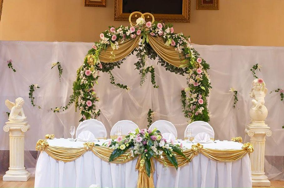 - Новобрачных должны свободно видеть все гости, поэтому их президиум лучше располагать в центре зала, на подиуме или в другой удобной точке.