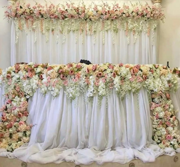 Пример классического свадебного оформления стола президиума: сочетание цветочного и тканевого декора, внимание к пространству за столом.