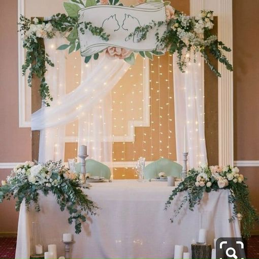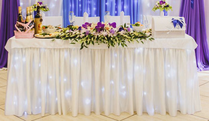 Стоит украсить их надписями, либо цветами, бантами или даже гирляндами.Отличный вариант — украшение стола жениха и невесты как на фото ниже, с использованием гирлянд. Выглядит празднично и торжественно.