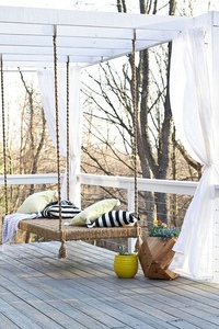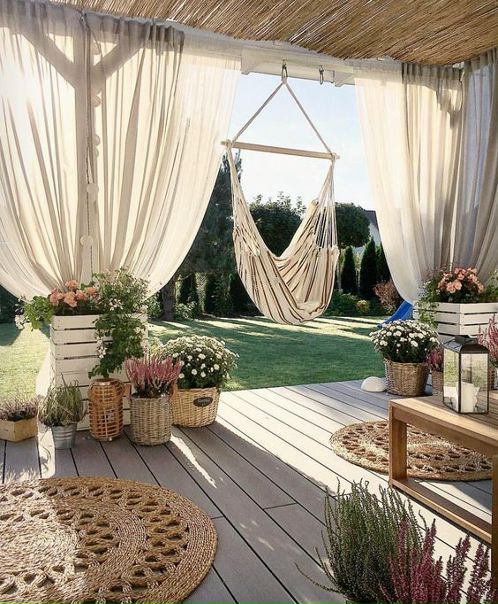 Зона отдыха с качелями и мягкой мебелью — еще один вариант. Подвесные диваны и качели позволяют расслабиться на свежем воздухе без ущерба для уровня комфорта. Добавьте небольшой столик и наслаждайтесь чашкой кофе или чая или положите книги и журналы для чтения.