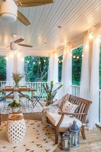 Пляжный или прибрежный стиль станет идеальным выбором для оформления веранды, если ваш дом расположен на берегу моря. Выбирайте светлые тона — белый является типичным основным цветом, вы можете добавить акценты синим, бирюзовым. Песочный цвет — тоже хороший вариант цветовой гаммы.Украсить корягами, ракушками, стеклом, веревкой и т. Д.