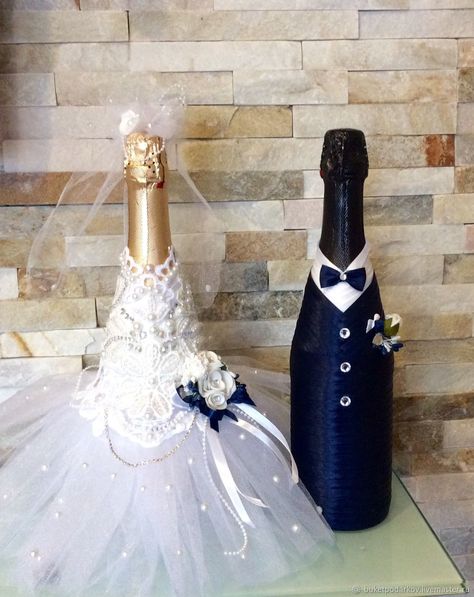 Оформление бутылок в виде жениха и невесты является самым популярным. Особенно, если декор подробно повторяет наряды молодоженов. Это выглядит интересно и необычно. Декорировать такие бутылки можно с помощью атласных лент, декупажа, используя бумагу, кожу, ткань, кружево. На бутылки можно наклеивать изображения голубей или обручальных колец.
