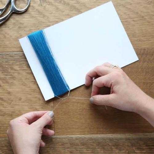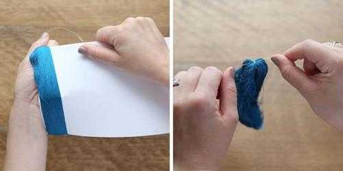 - Когда все нити намотаны, в одном из концов картона необходимо связать намотанный кусок пряжи. Как это сделать, показано ниже на иллюстрации.