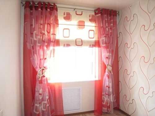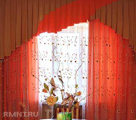 Ярко-красный бант стал центром этой двухслойной композиции. Кроме того, он выполняет и важную функцию — служит креплением для складок занавеси
