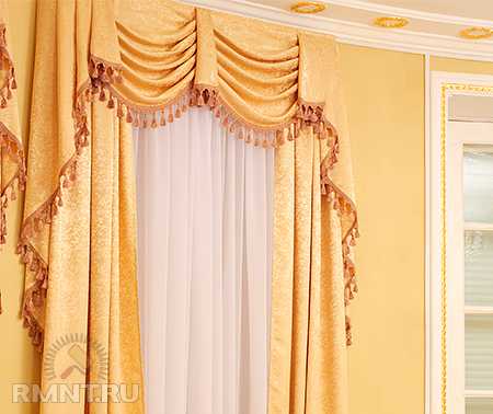 Драпировку ламбрекена можно украсить тесьмой или бахромой, подобрать ткань, которая будет отличаться от основной шторы, но при этом гармонично сочетаться с ней. Складки обычно сразу прострачиваются, что облегчает процесс стирки ламбрекена и позволяет затем легко повесить его на место.
